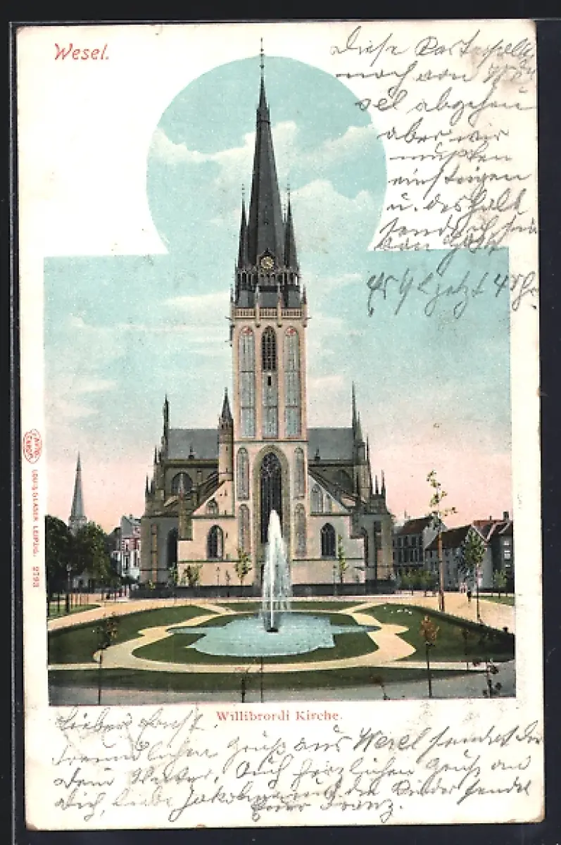 AK Wesel / Rhein, Willibrordi-Kirche mit Springbrunnen