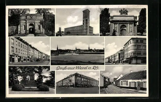 AK Wesel a. Rh., Ortspanorama, Denkmal, Strasse durch die Stadt, Rathaus