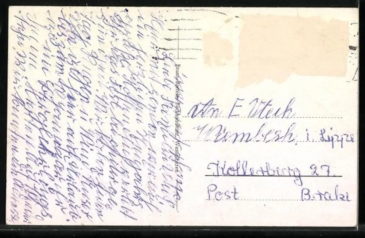 Personenbezogene Daten auf der Rückseite der Karte wurden durch blauen Textmarker unkenntlich gemacht. Die blauen Stellen sind auf die Vorderseite durchgeweicht und wirken sich negativ auf das Postkartenfoto aus