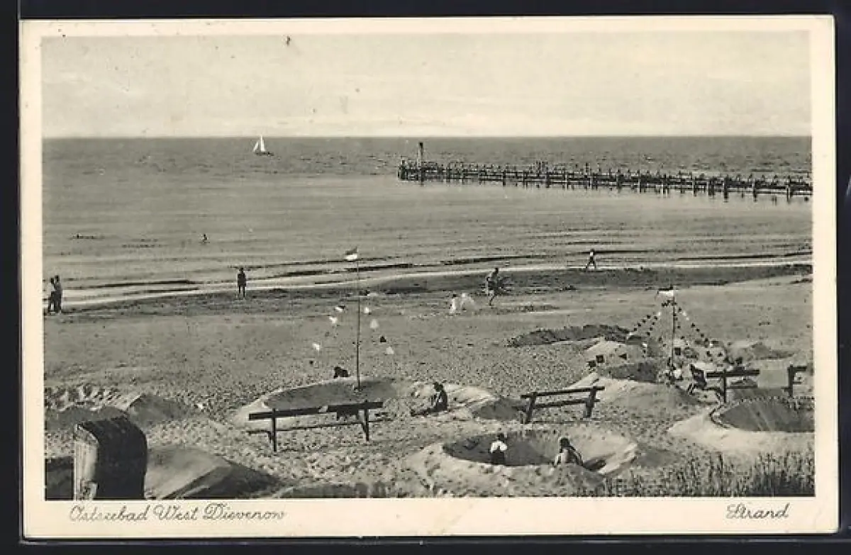 AK West Dievenow, Strand mit Buhne und Ruhebänken