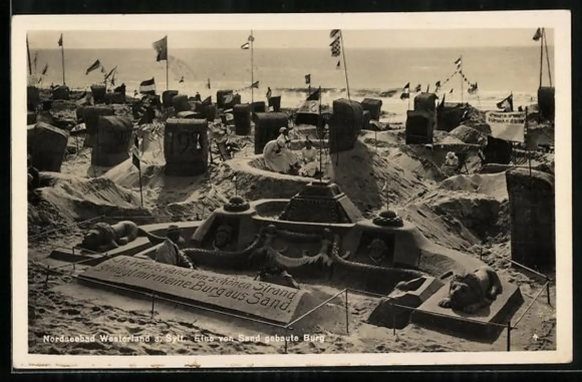 AK Westerland a. Sylt, Nordseebad, Eine von Sand gebaute Burg, Sandplastik