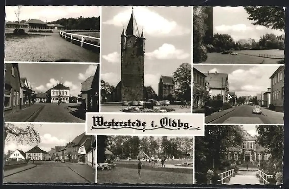 AK Westerstede i. Oldbg., Kirche mit Gedenkstein, Spielplatz, Strassenpartie