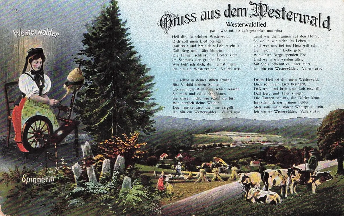 AK Westerwaldlied Westerwälder Spinnerin Bauer mit einer Kuhherde 1917 gelaufen -797764