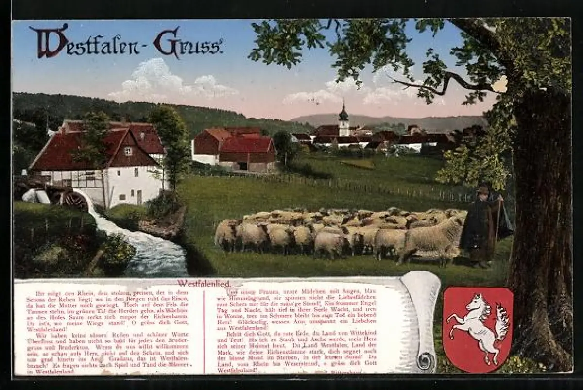 AK Westfälische Ortschaft mit Schafherde, Wappen, Text Westfalenlied