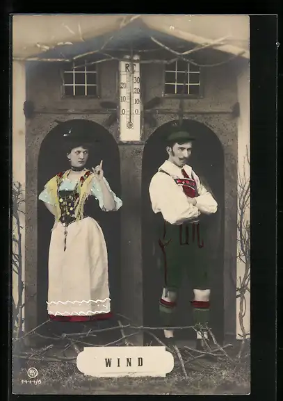 AK Wettersäule - Frau scheltet ihren Mann unter einem Thermometer