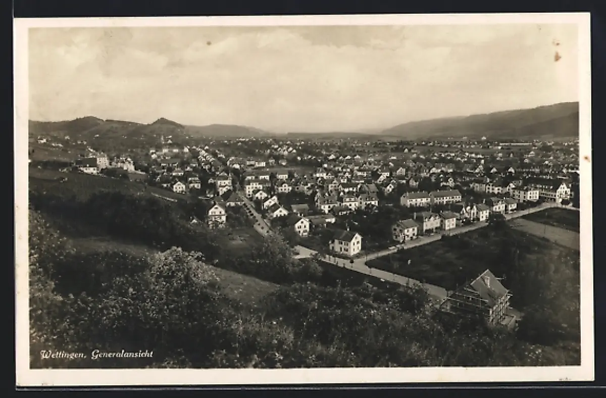 AK Wettingen, Gesamtansicht von einem Berg aus, mit Haus im Bau