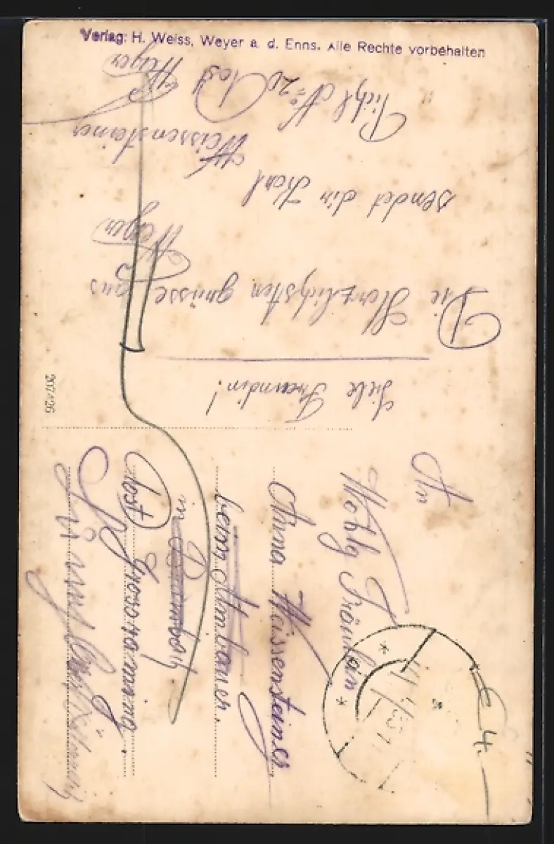 Personenbezogene Daten auf der Rückseite der Karte wurden durch blauen Textmarker unkenntlich gemacht. Die blauen Stellen sind auf die Vorderseite durchgeweicht und wirken sich negativ auf das Postkartenfoto aus