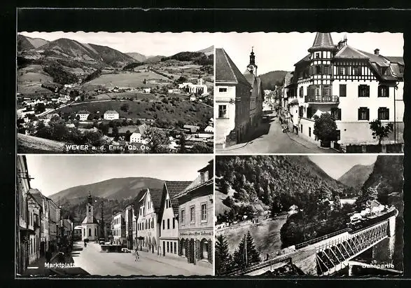 AK Weyer a. d. Enns, Strassenpartie mit Geschäft, Marktplatz mit Kirche, Bahnpartie