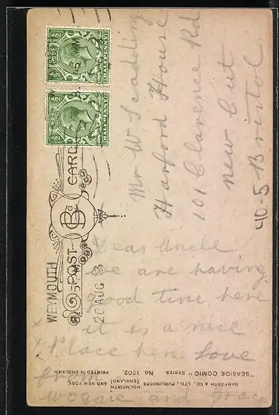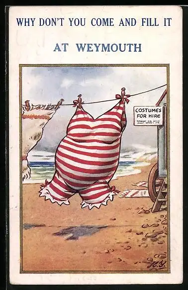 AK Weymouth, Strand mit Badeanzug einer dicken Dame an der Wäscheleine