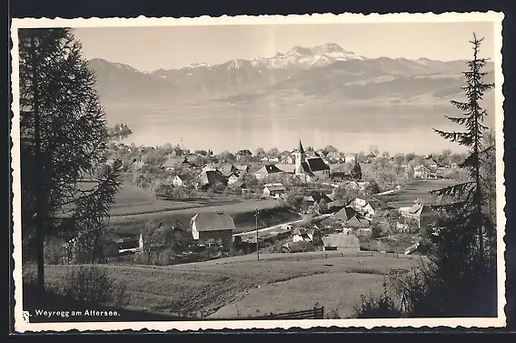 AK Weyregg a. Attersee, Ortspanorama mit Gebirge