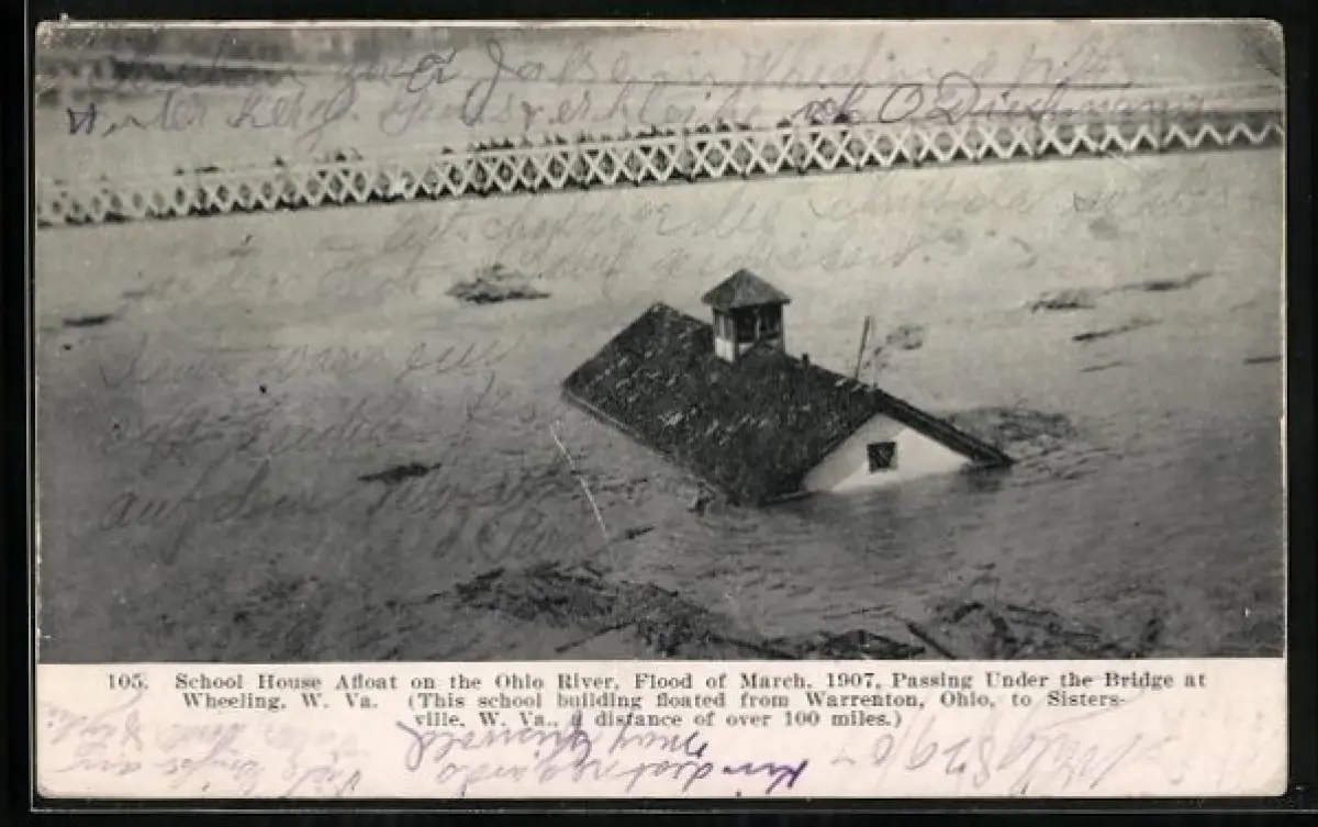 AK Wheeling, WV, Hochwasser 1907, vom Ohio-River mitgerissene Schule