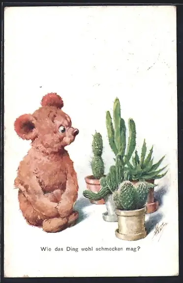 AK Wie das Ding wohl schmecken mag?, Teddybär mit Kakteen in Töpfen
