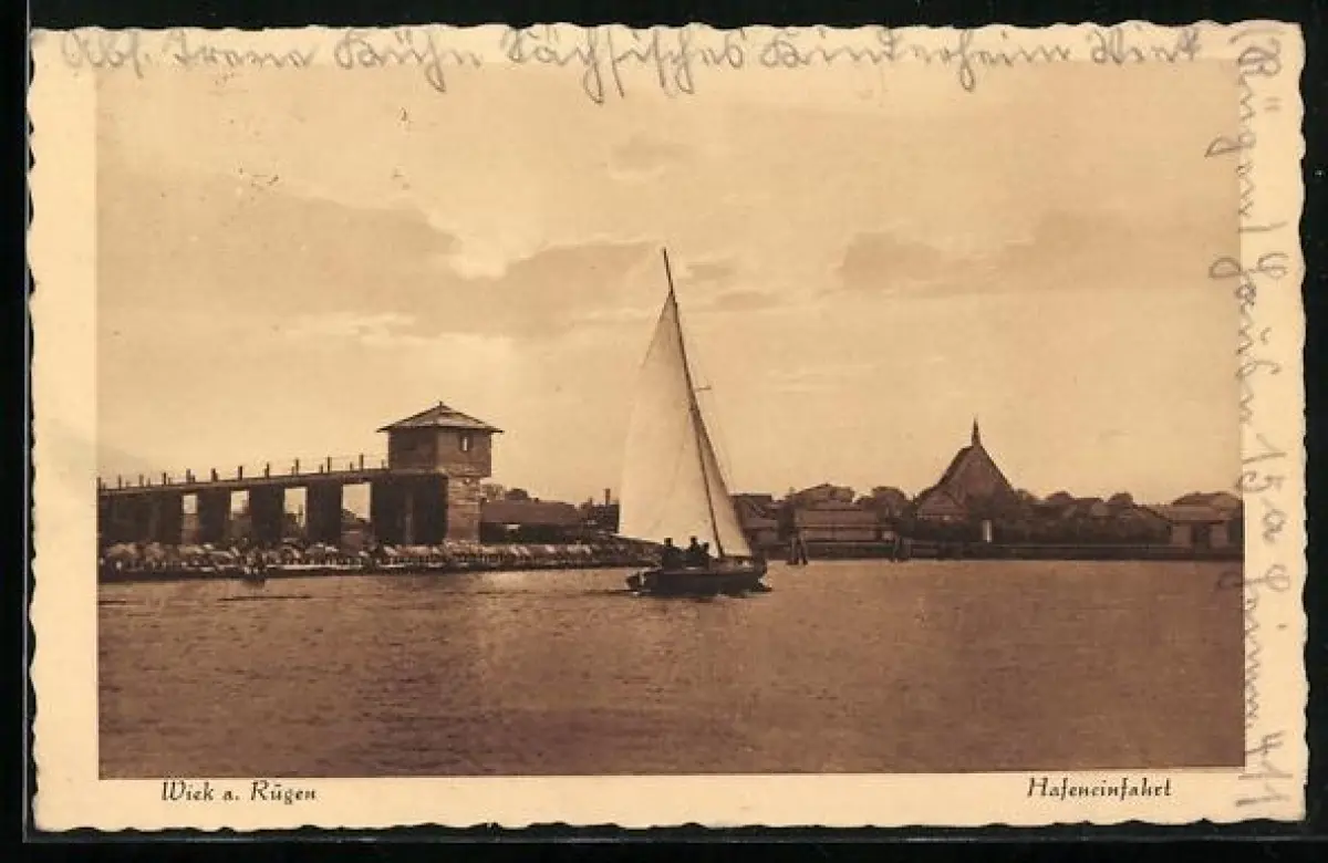 AK Wiek a. Rügen, Hafeneinfahrt mit Segelboot