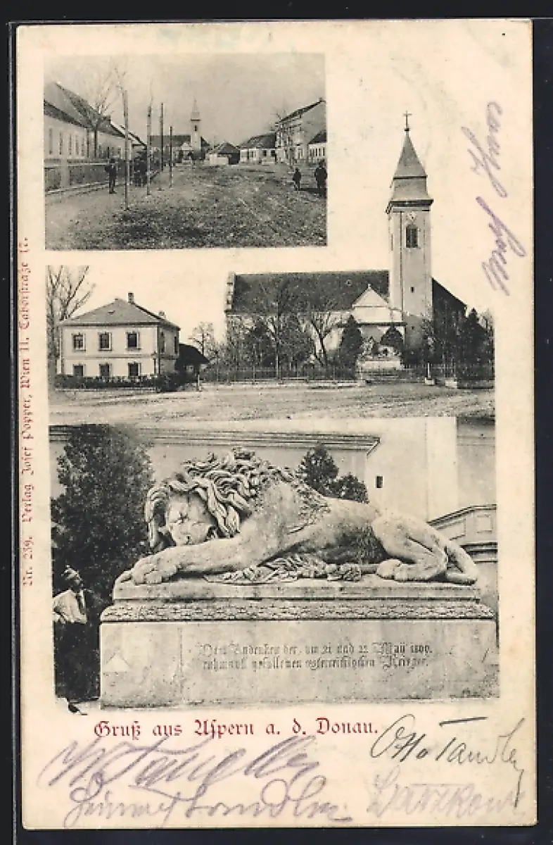 AK Wien, Aspern a. d. Donau, Kirche, Löwendenkmal, Strassenpartie mit Kirche