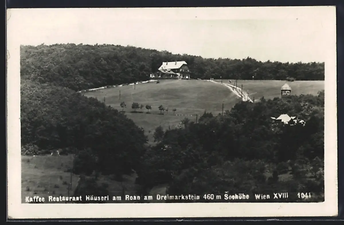 AK Wien, Dreimarkstein, Kaffee Restaurant Häuserl am Roan J. Bodenstein, Weidlingbach 58, Ansicht m. Umgebung, Turm