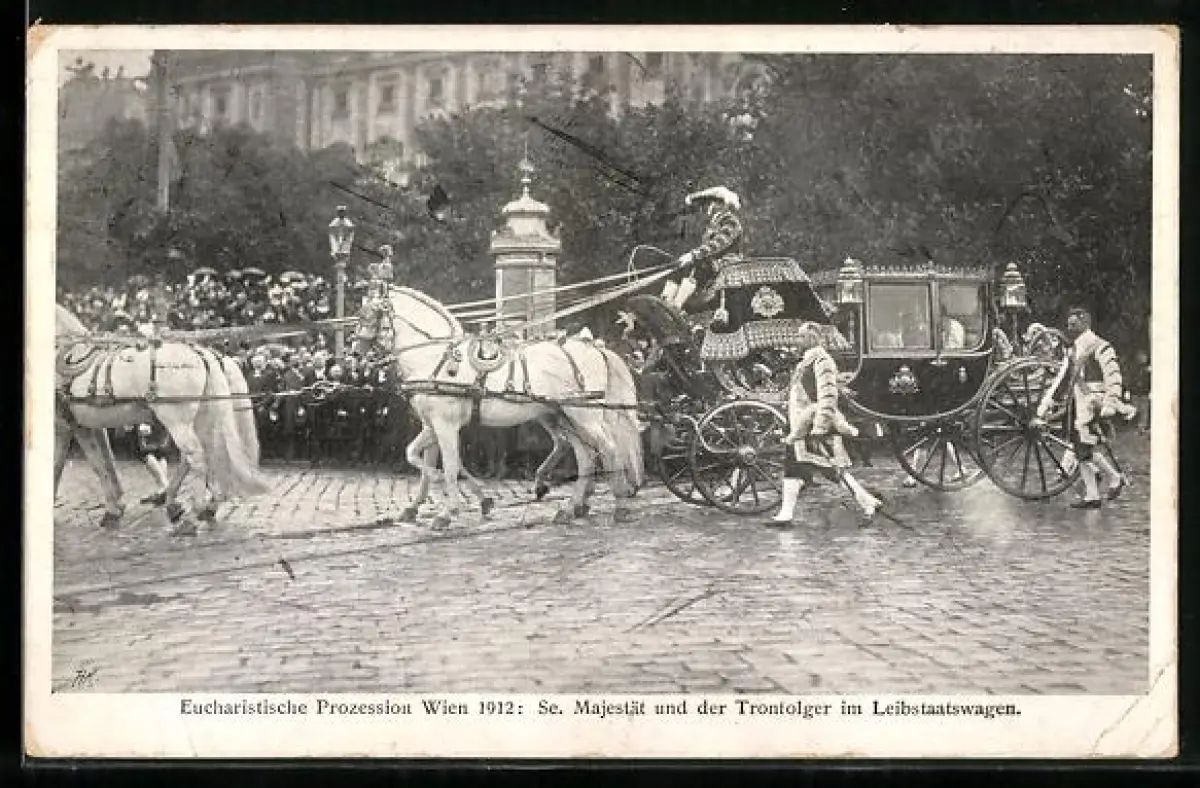 AK Wien, Eucharistische Prozession 1912: Se. Majestät und Thronfolger im Leibstaatswagen, Kaiser Franz Josef I. von Öste