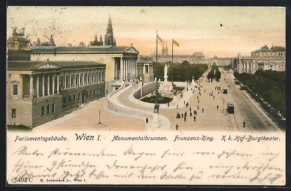 AK Wien, Franzens-Ring mit Parlamentsgebäude und Monumentalbrunnen