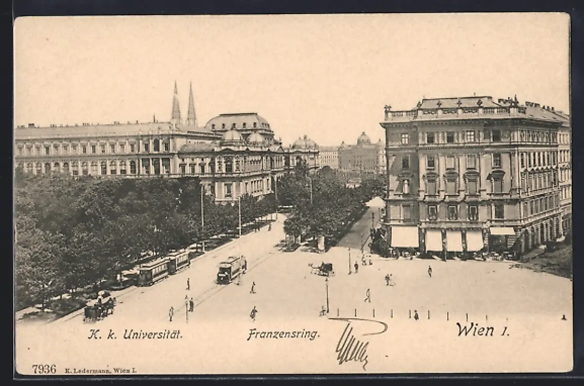 AK Wien, Franzensring mit Strassenbahn u. Universität aus der Vogelschau
