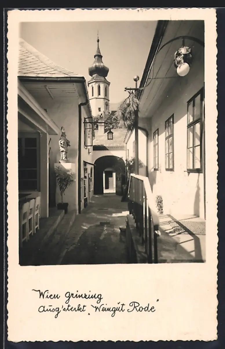 AK Wien, Grinzing, Gasthaus ausg`steckt Weingut Rode, Strassenpartie mit Kirchturm