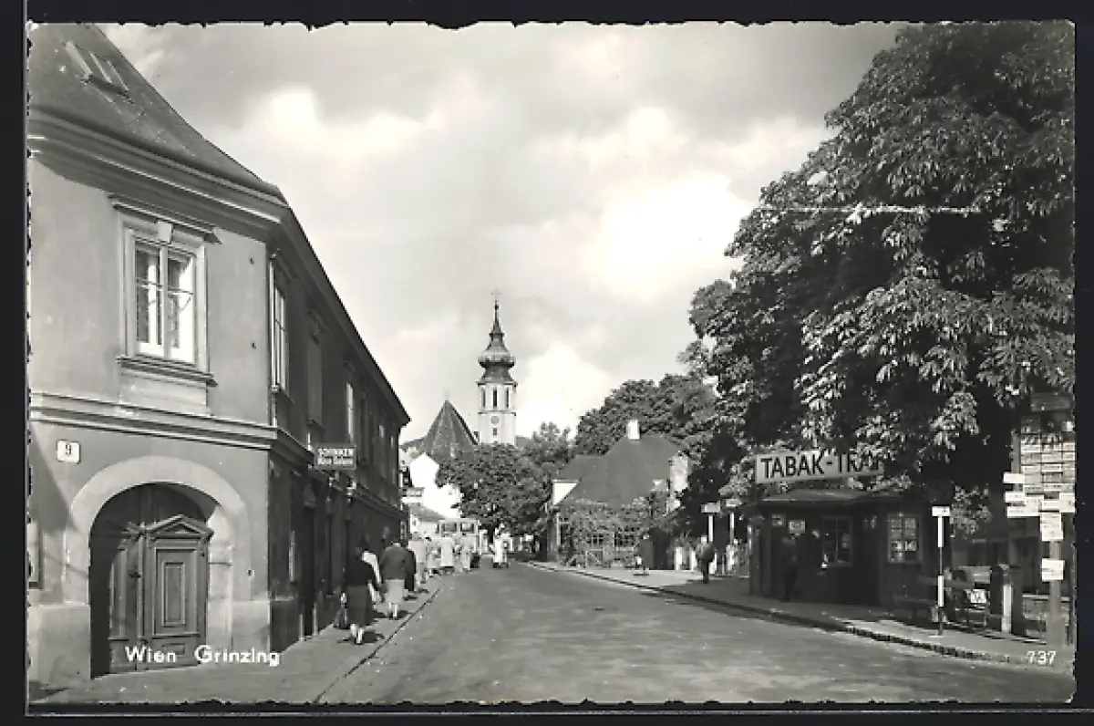 AK Wien, Grinzing, Strassenpartie mit Kiosk und Kirche