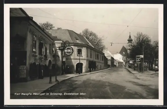 AK Wien-Grinzing, Strassenpartie mit Kirche und Gaststätte Hengls Heuriger