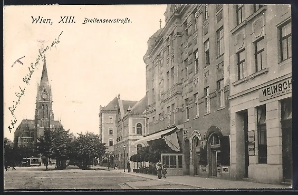 AK Wien-Hietzing, Breitenseerstrasse mit Blick zur Kirche