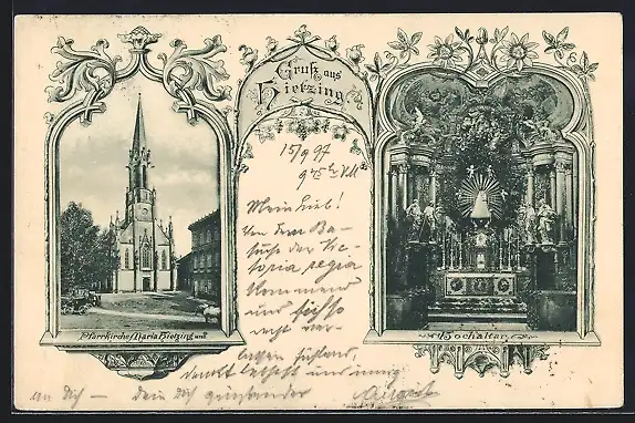 AK Wien, Hietzing, Pfarrkirche Maria Hietzing, Aussenansicht, Hochaltar