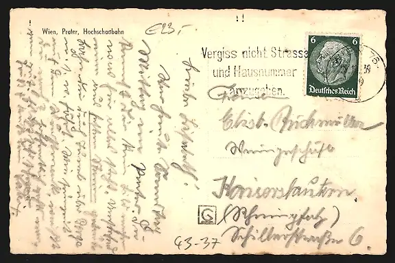 Personenbezogene Daten auf der Rückseite der Karte wurden durch blauen Textmarker unkenntlich gemacht. Die blauen Stellen sind auf die Vorderseite durchgeweicht und wirken sich negativ auf das Postkartenfoto aus