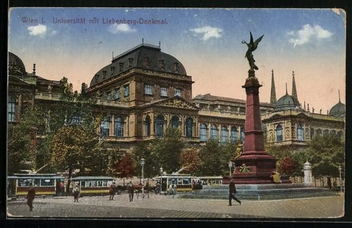 AK Wien I., Strassenbahn in Fahrt vor der Universität, Liebenberg-Denkmal