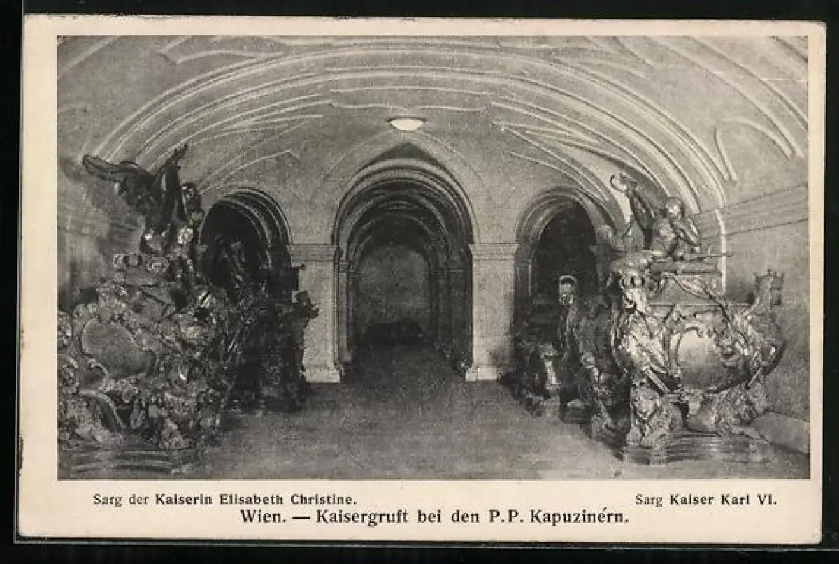 AK Wien, Kaisergruft bei den P. P. Kapuzinern, Sarg der Kaiserin Elisabeth Christine, Sarg Kaiser Karl VI