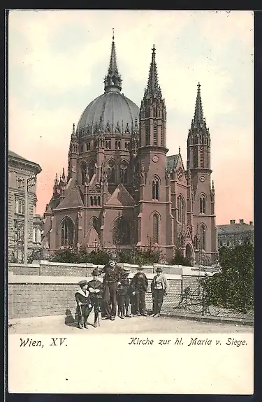 AK Wien, Kirche zur hl. Maria vom Siege mit kleiner Versammlung