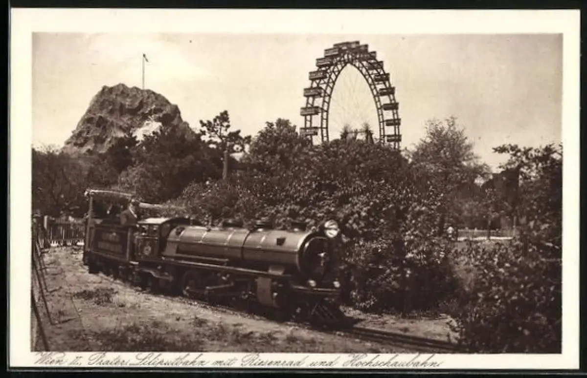 AK Wien, Liliputbahn mit Riesenrad u. Hochschaubahn im Wiener Prater