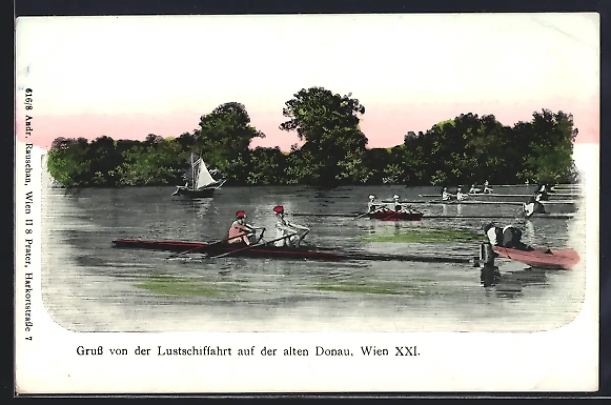AK Wien, Lustschiffahrt auf der alten Donau, Ruderboote, Segelboot