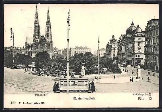 AK Wien, Maximilianplatz mit Votivkirche, Strassenbahn und Währingerstrasse