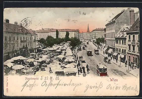 AK Wien, Naschmarkt mit Strassenbahnen
