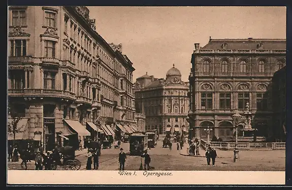 AK Wien, Oper, eine Strassenbahn in der Operngasse