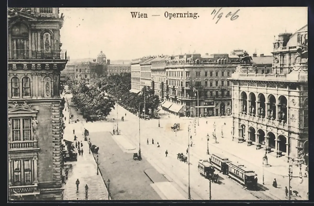 AK Wien, Opernring mit Strassenbahnen aus der Vogelschau
