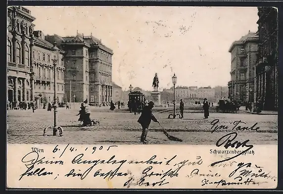 AK Wien, Partie am Schwarzenbergplatz, Strassenbahn, Strassenfeger