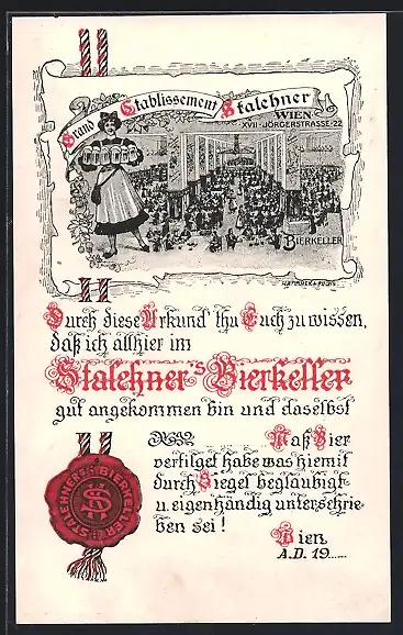 AK Wien, Restaurant Etablissement Stahlener, Jörgerstrasse 22, Bierkeller, Trinkerurkunde