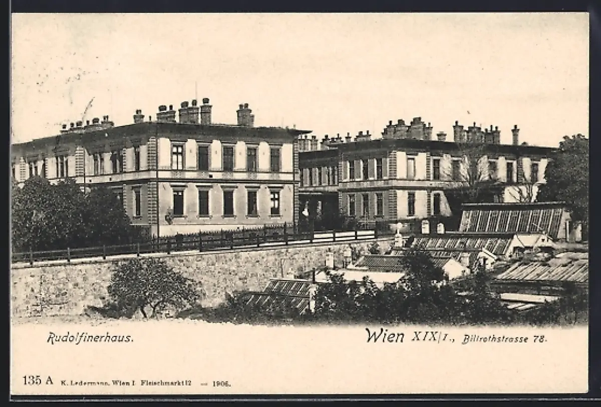 AK Wien, Rudolfinerhaus, Billrothstrasse 78, Ansicht mit Gewächshäusern aus der Vogelschau
