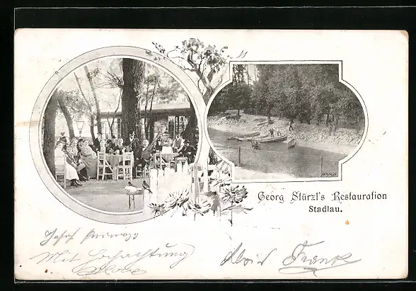 AK Wien-Stadlau, Georg Stürzl`s Restauration, Gartenansicht m. Gästen, Boote am Ufer