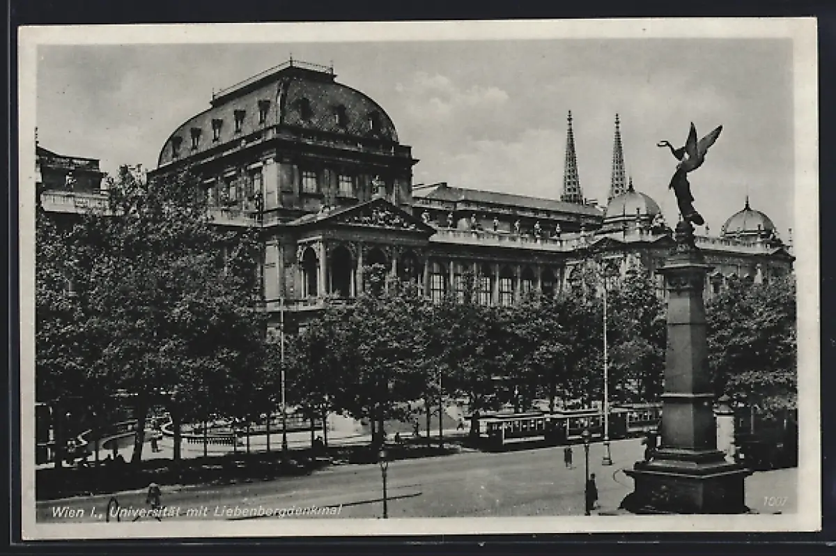 AK Wien, Universität mit Liebenbergdenkmal und Strassenbahn