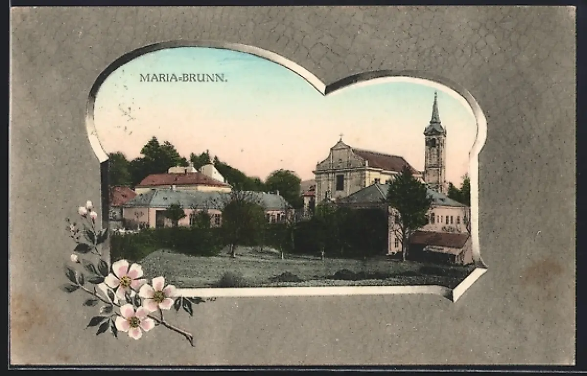 AK Wien XIV, Maria Brunn, Teilansicht im Rahmen mit Blumen