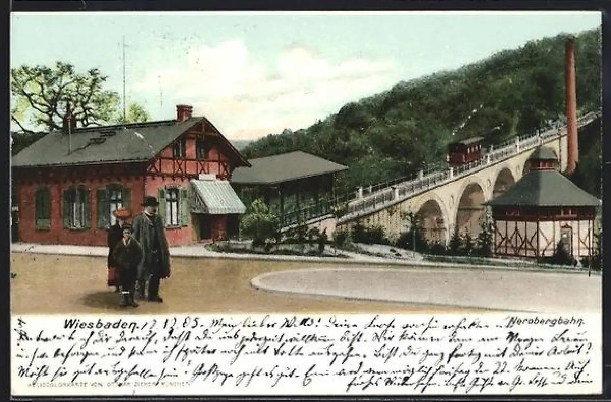 AK Wiesbaden, Familie vor Station der Nerobergbahn