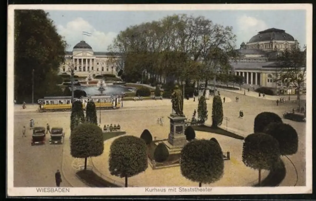AK Wiesbaden, Kurhaus mit Staatstheater und Strassenbahn aus der Vogelschau