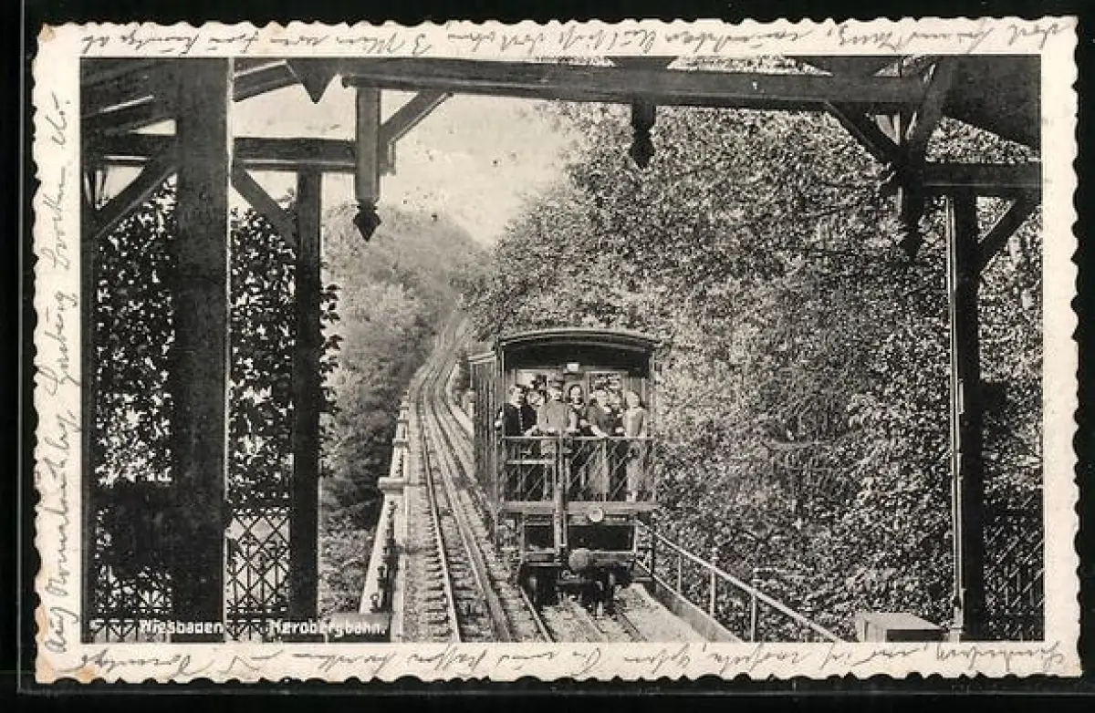 AK Wiesbaden, Nerobergbahn mit Zugführer u. Fahrgästen vor einer Station