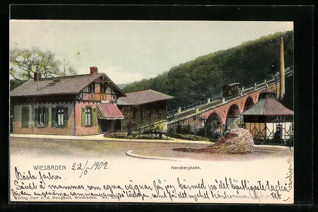 AK Wiesbaden, Station mit einfahrender Bergbahn vom Neroberg
