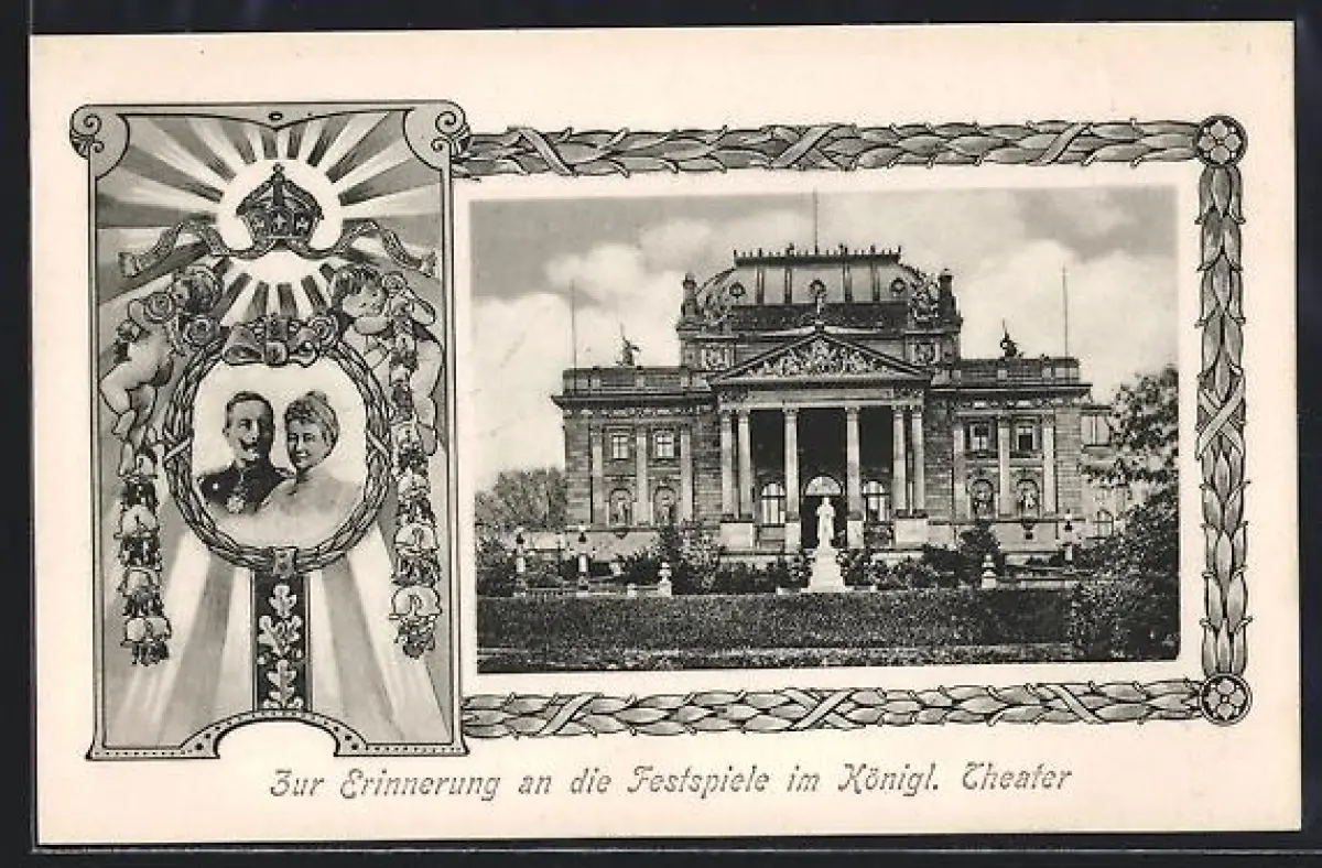 AK Wiesbaden, Zur Erinnerung an die Festspiele im Königlichen Theater mit Porträt von Kaiserpaar Wilhelm und Augusta