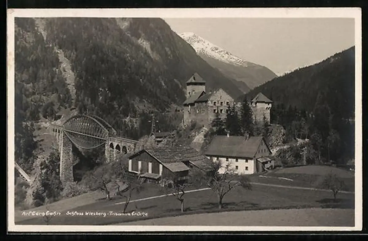 AK Wiesberg, Arlbergbahn mit Trisannabrücke u. Schloss