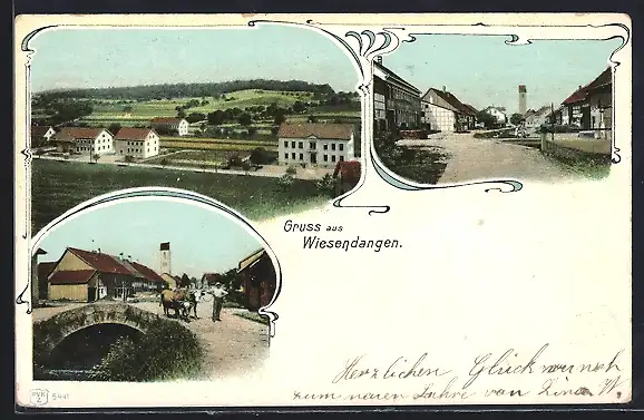 AK Wiesendangen, Strassenpartie mit Brücke, Ochsengespann, Teilansicht aus der Vogelschau